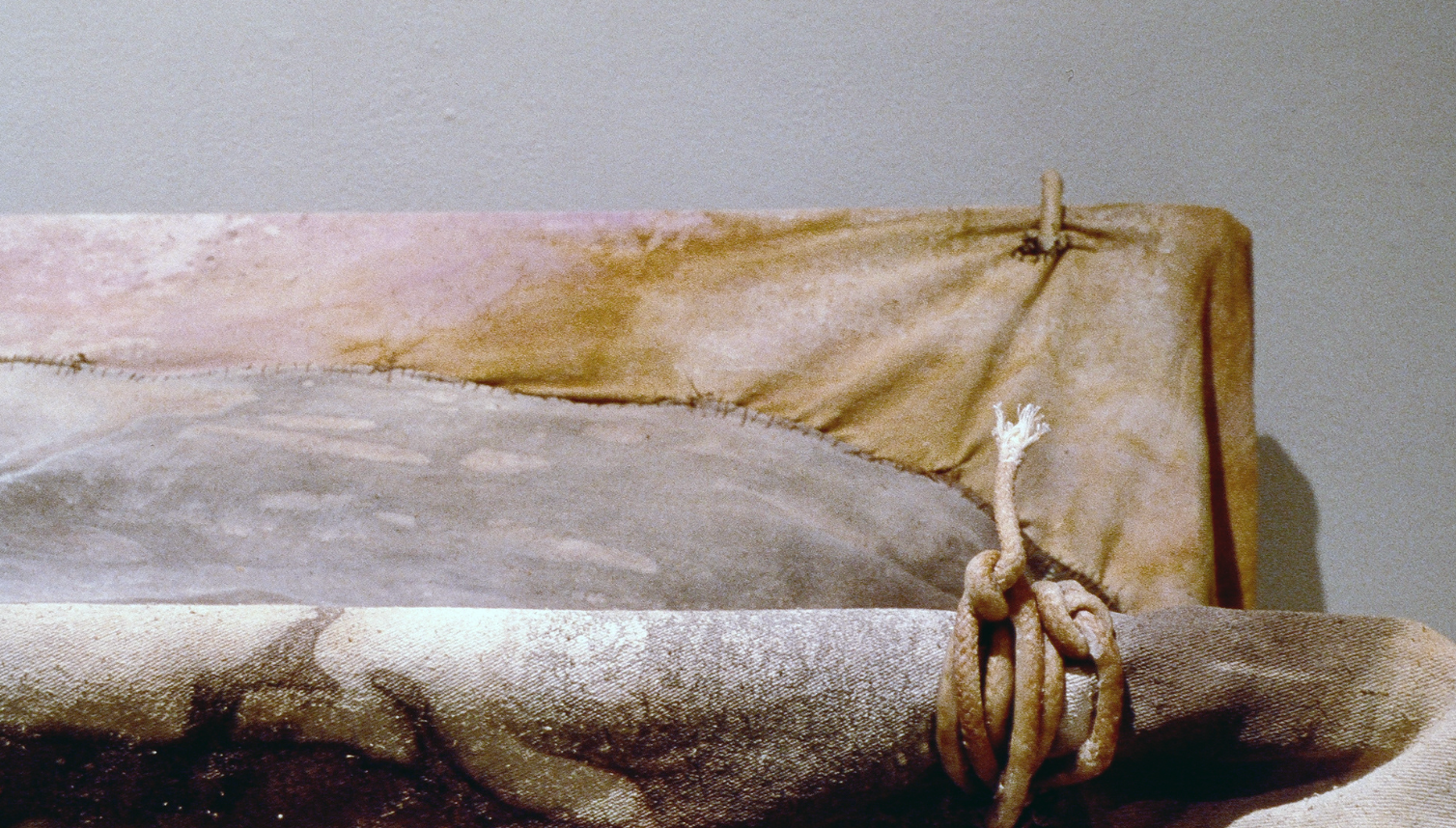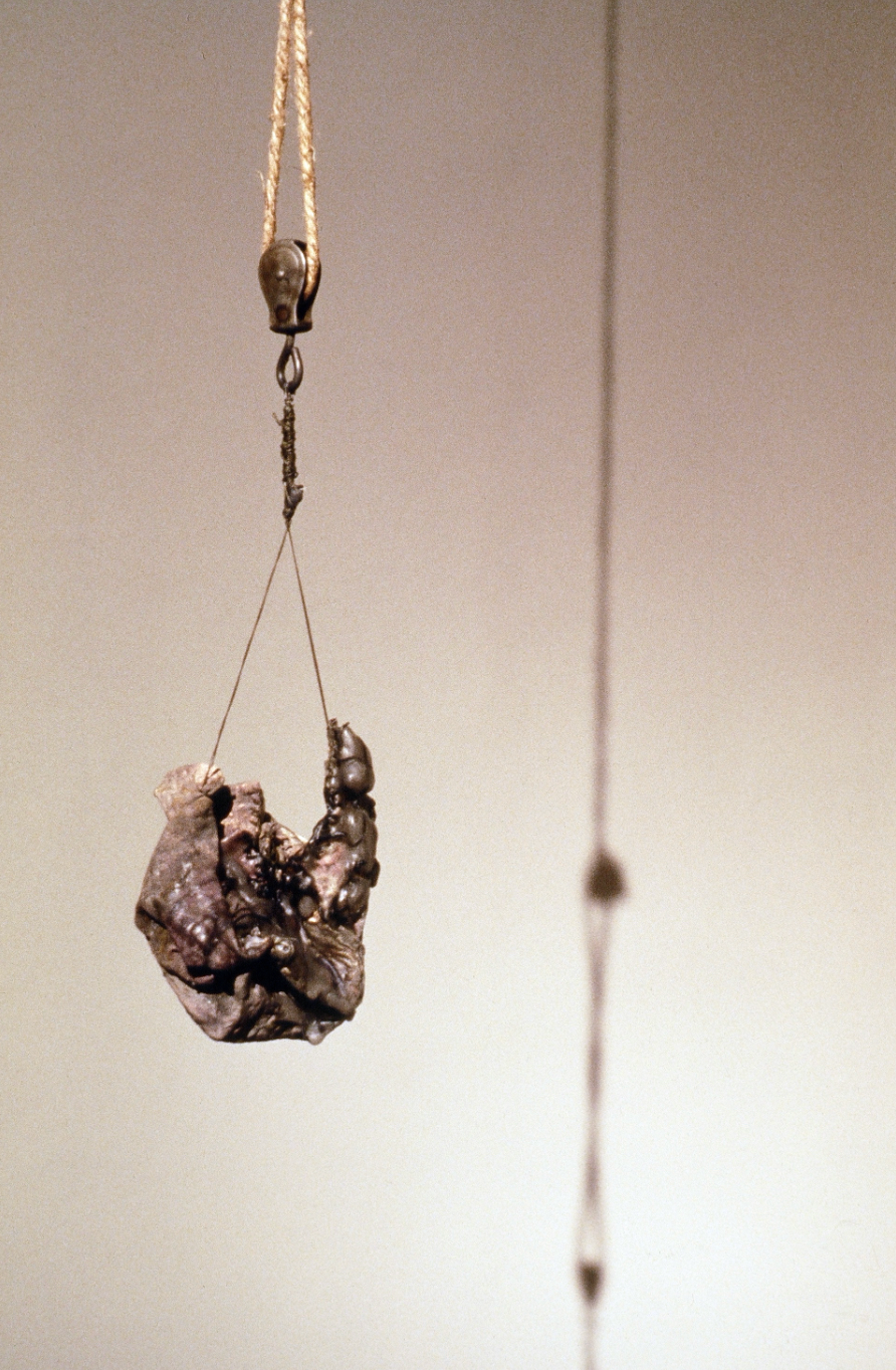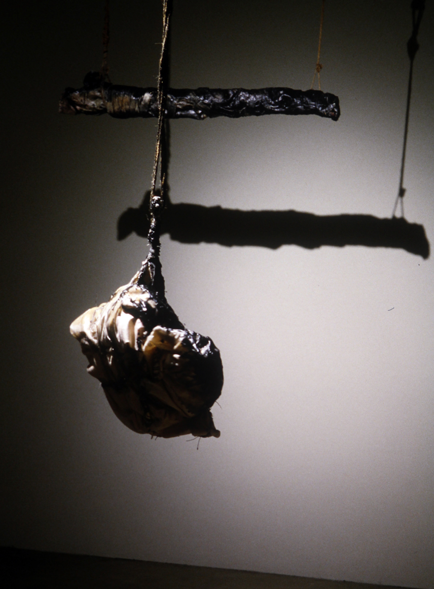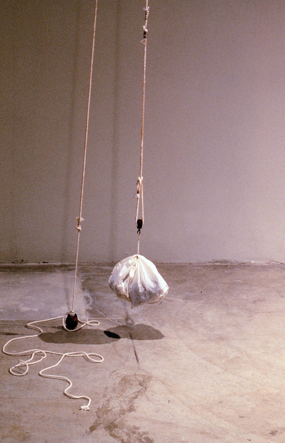 Rock Bag 1995, canvas, rocks, thread, wax, rope, pulley;