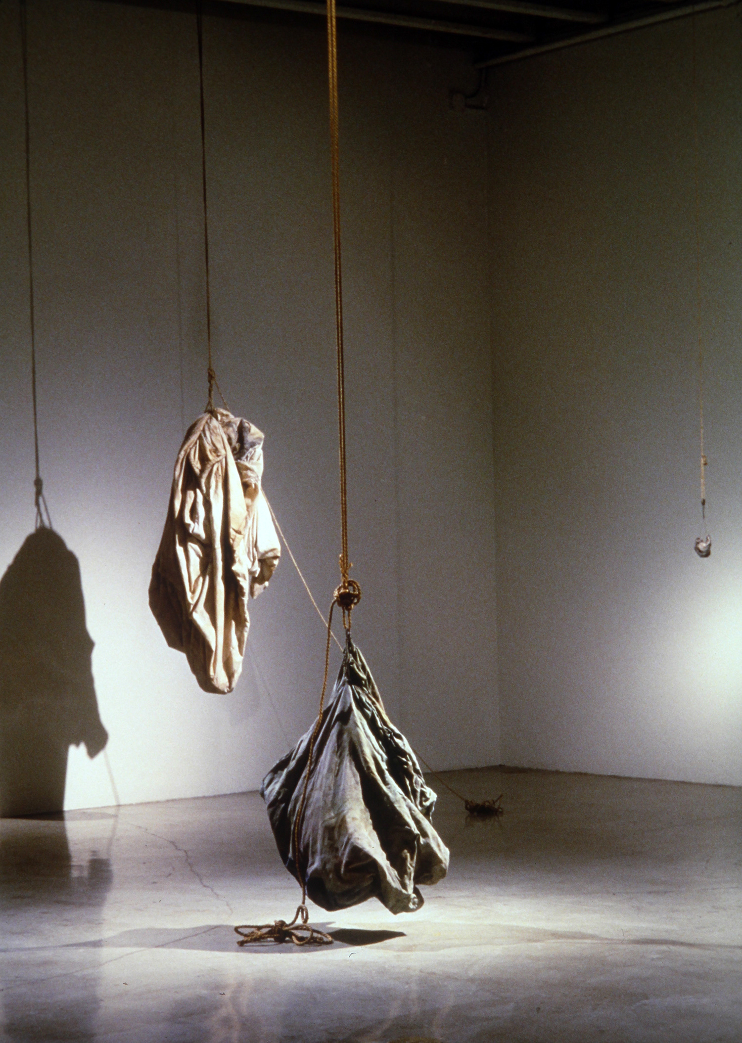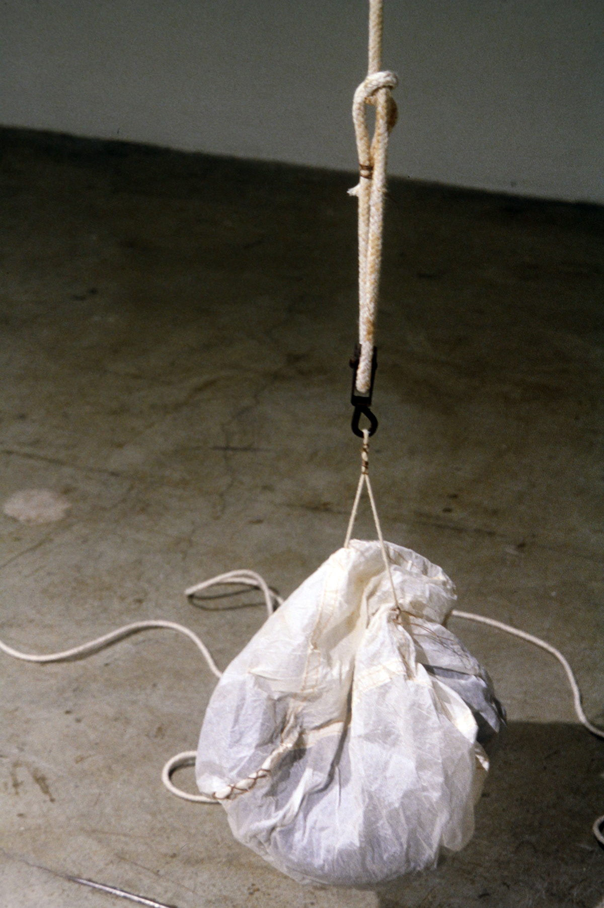 Chute 1995, recovered parachute, hog rings, wax, rope; 96" x 36" x 36"