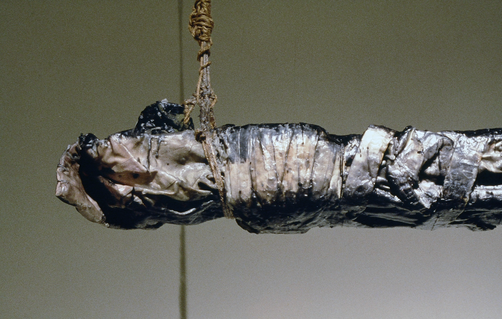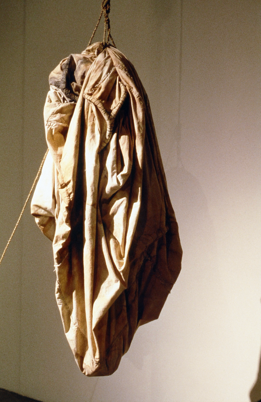 Chute 1995, recovered parachute, hog rings, wax, rope;