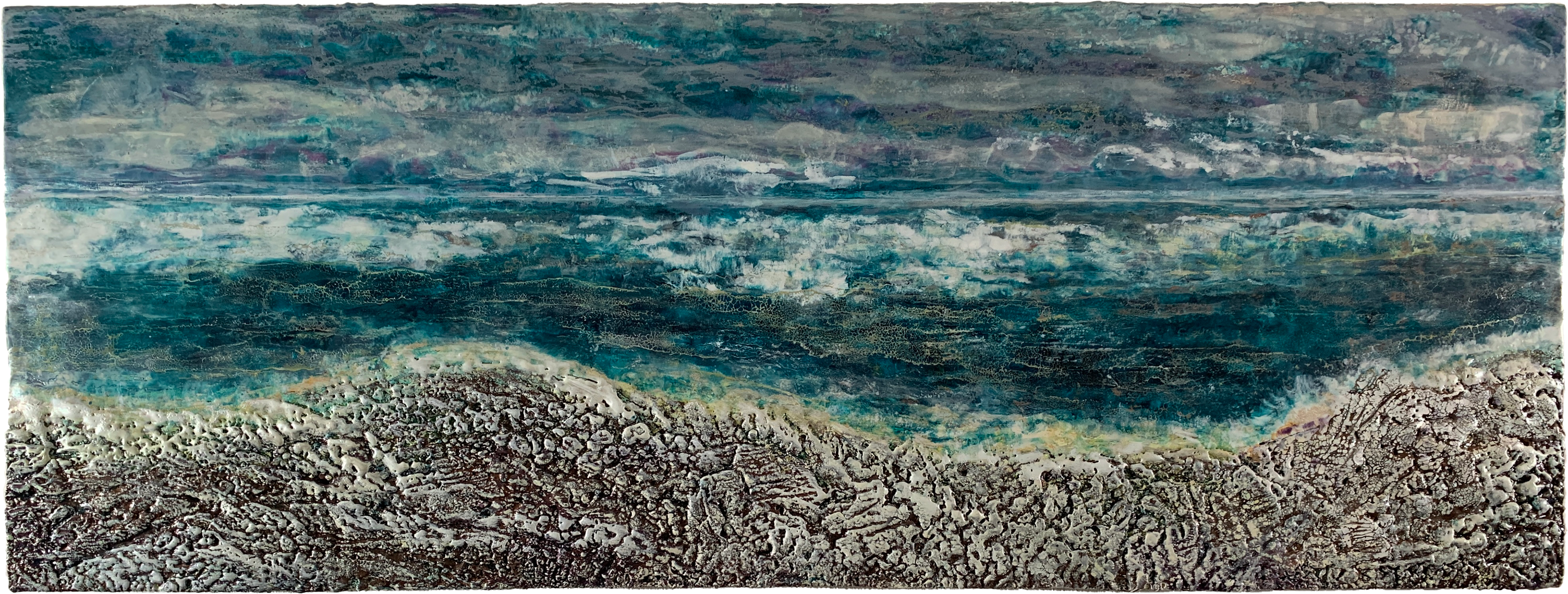 Working with nature-based themes, Deborah Paulsen is inspired by the local scenery in Ventura, California, and other travels. The methods used with encaustic paint create luminescent, sensual colors as the paint is applied and manipulated in a molten state. Fantastical shapes and textures are revealed through the processes. Layers of the encaustic medium are fused with a torch so that the colors mix and marble to create surreal effects as the layers are excavated with pottery tools. Elements of the land, such as rocky protrusions, are carved into the relief design.
